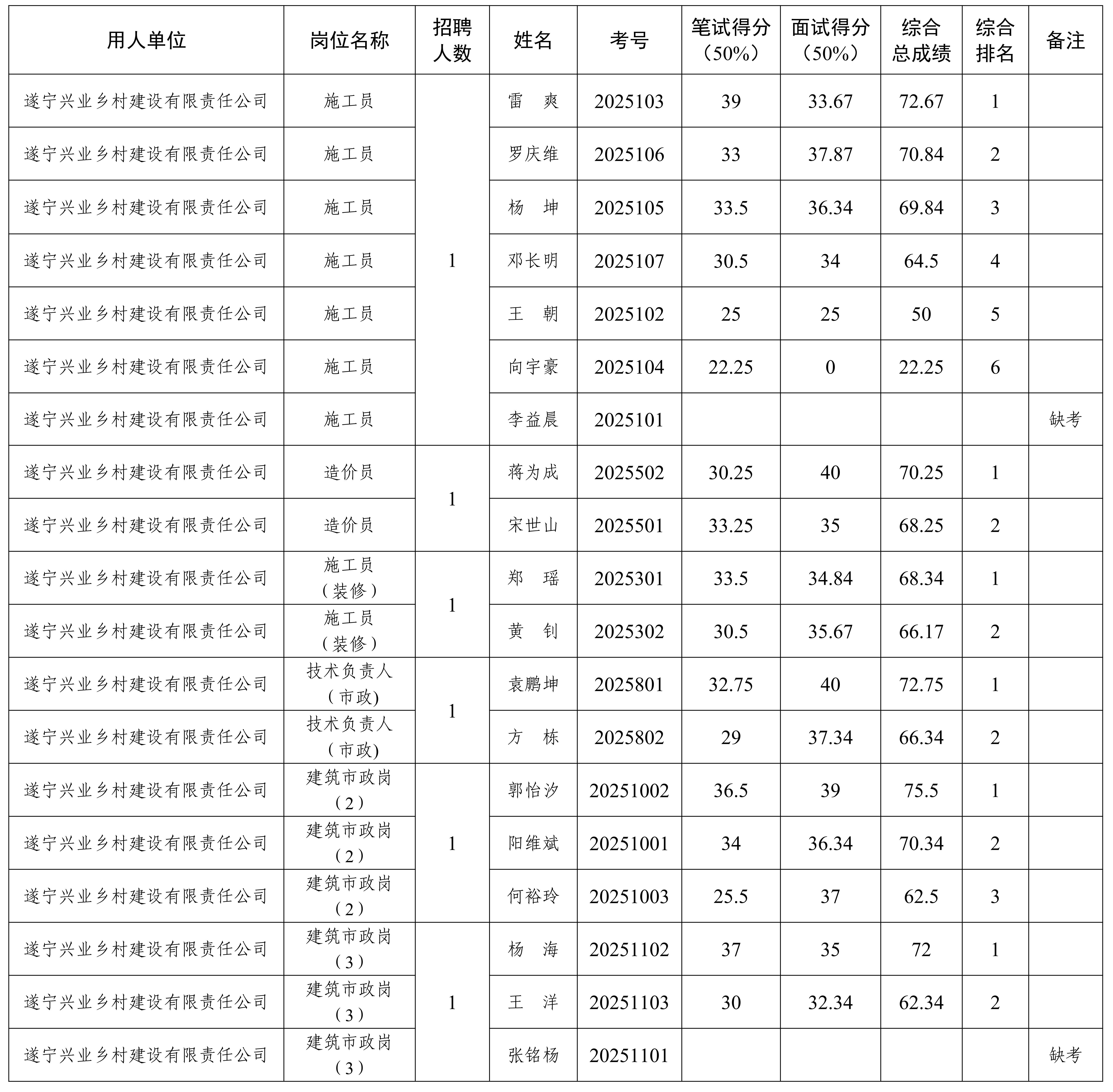 按照《遂寧興業投資集團有限公司項目合同制用工招聘公告》相關規定,公開招聘項目合同制工作人員的筆試、面試工作已于2025年8月9日結束,現將綜合總成績及排名情況予以公示。